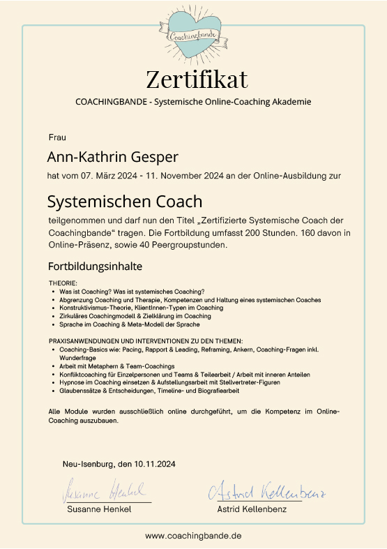 Als systemischer Coach lege ich größten Wert auf Professionalität und eine qualitativ hochwertige sowie fundierte Ausbildung. Mein Abschluss in Grundlagen Psychologie in Kombination mit meiner Coaching-Ausbildung sowie der Dachverbands-Zertifizierung, bilden die Basis meiner Arbeit.
